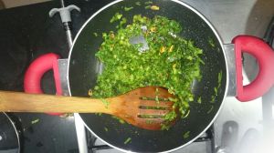 Add salt, turmeric, stir it for 10 seconds and now Add finely chopped spinach. Stir it again to mix all the ingredient and lid the pan. Keep it on flame for 10 minutes , don’t miss to stir in between to ensure that non stick is doing its job., and of course our not so palak paneer is being cooked.