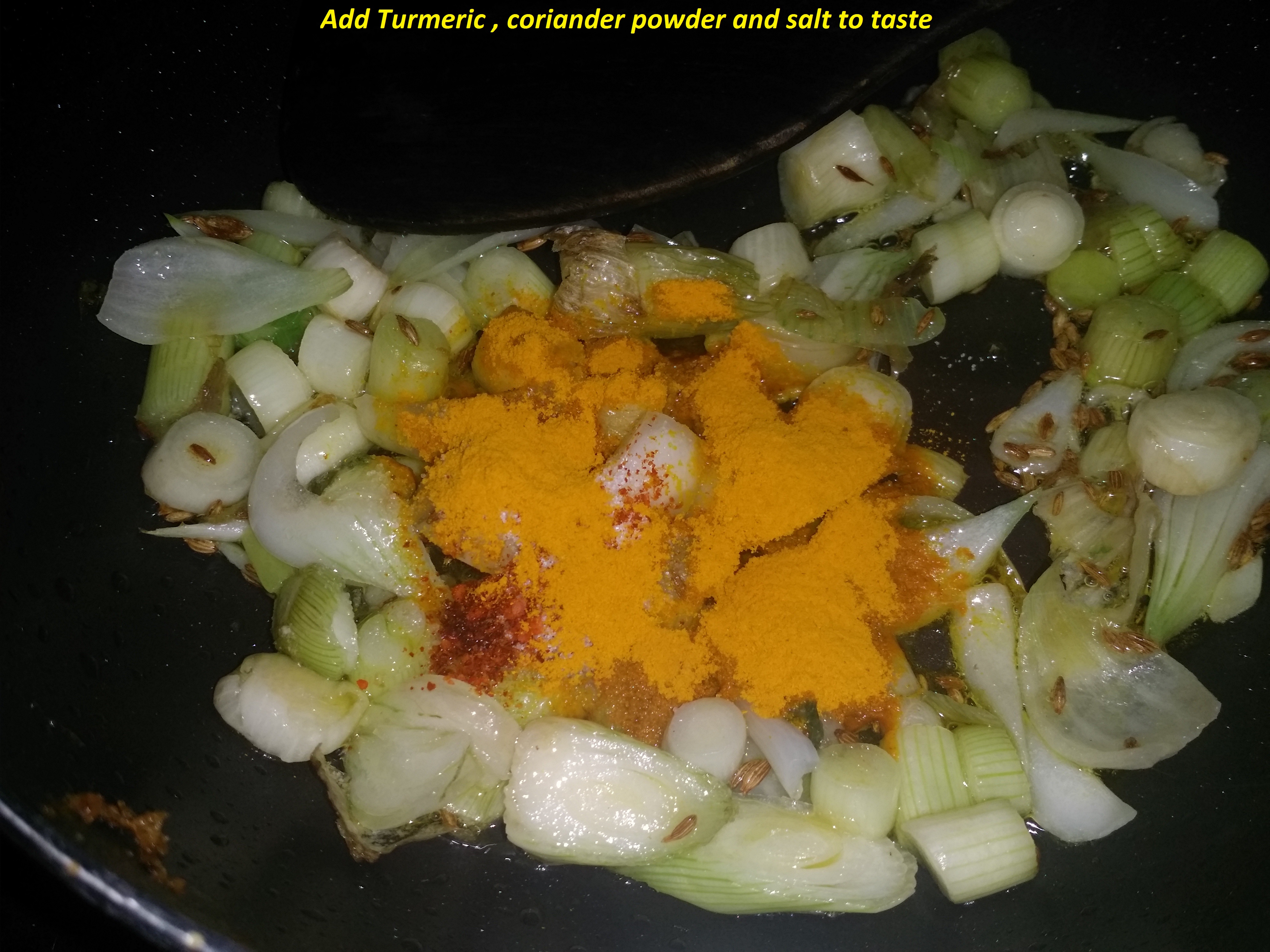 Take a non stick pan, put it on flame. add olive oil when its ready ad cumin seeds now add diced onions, green chilli and the soft white stems. Saute it in the olive oil. Add turmeric powder, coriander powder and salt to taste. Add dices potatoes. Let it cook on sim flame till potatoes turn light golden. Now add the remaining finely chopped green part of the spring onion.