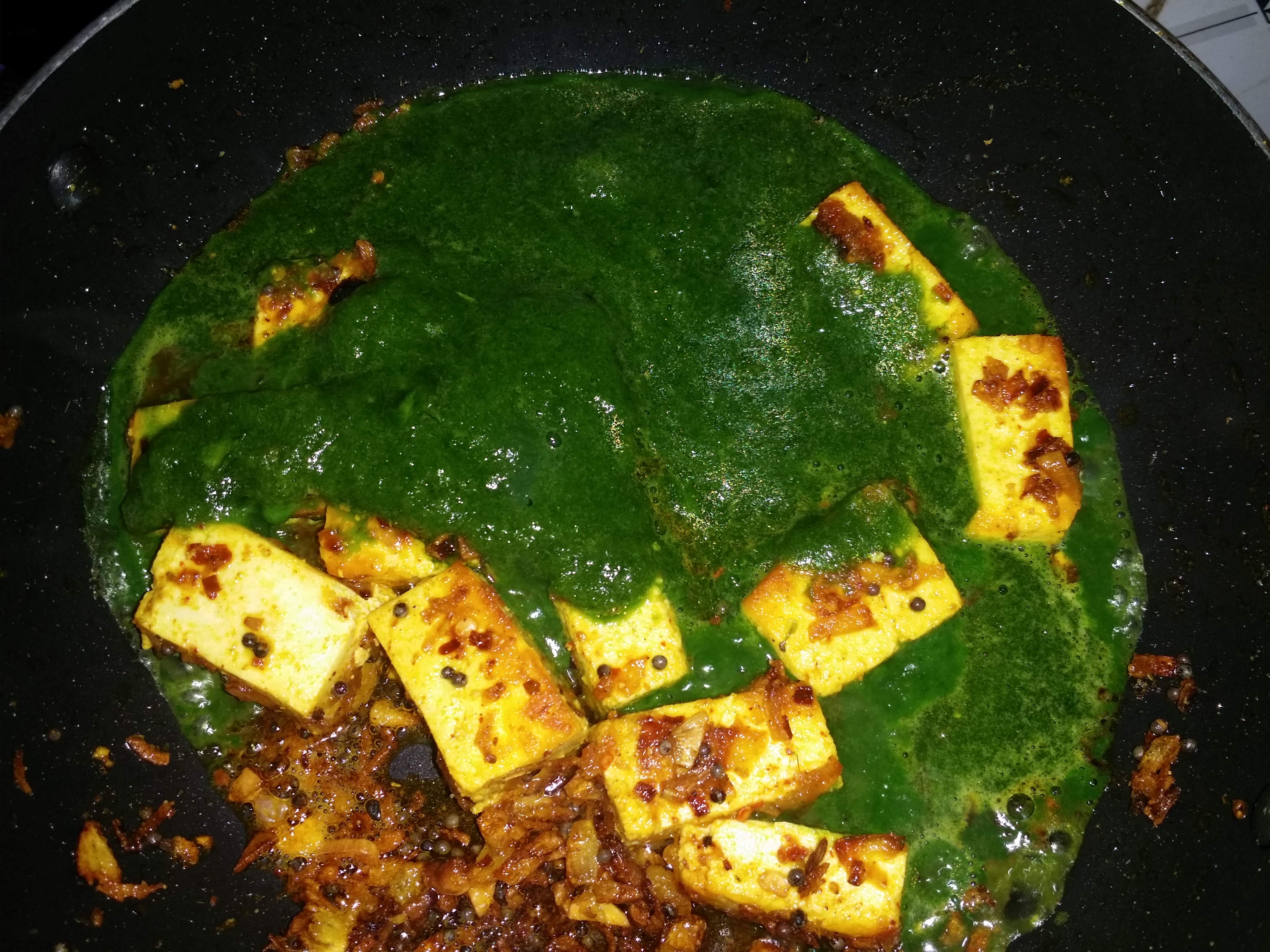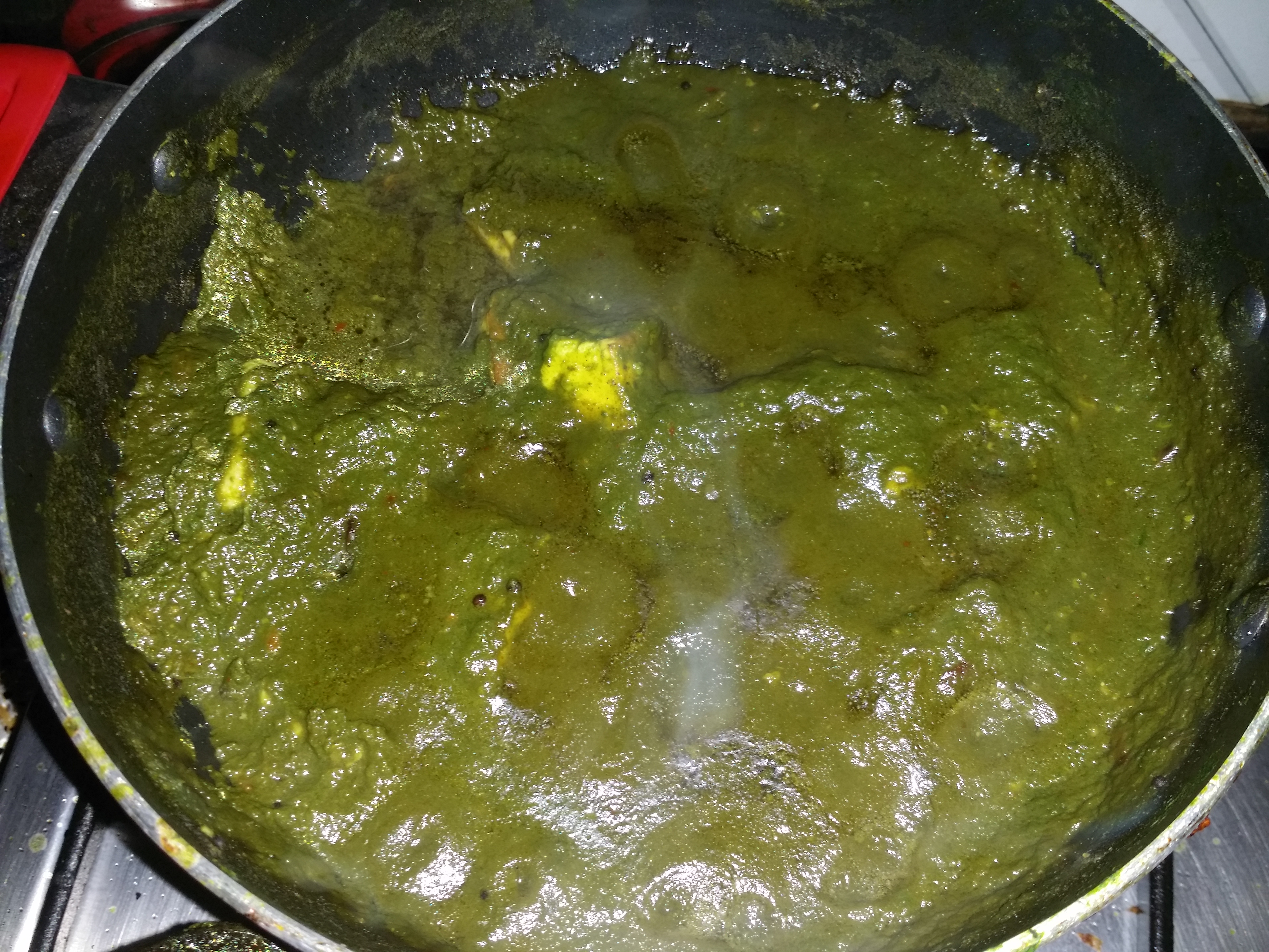 Preparation: Wash spinach, green chilli and tomato thoroughly. And grind it in mixer grinder. ( few people boil spinach and tomatoes before grinding it , so you may choose as you wish) Finely chop onion, garlic, ginger.