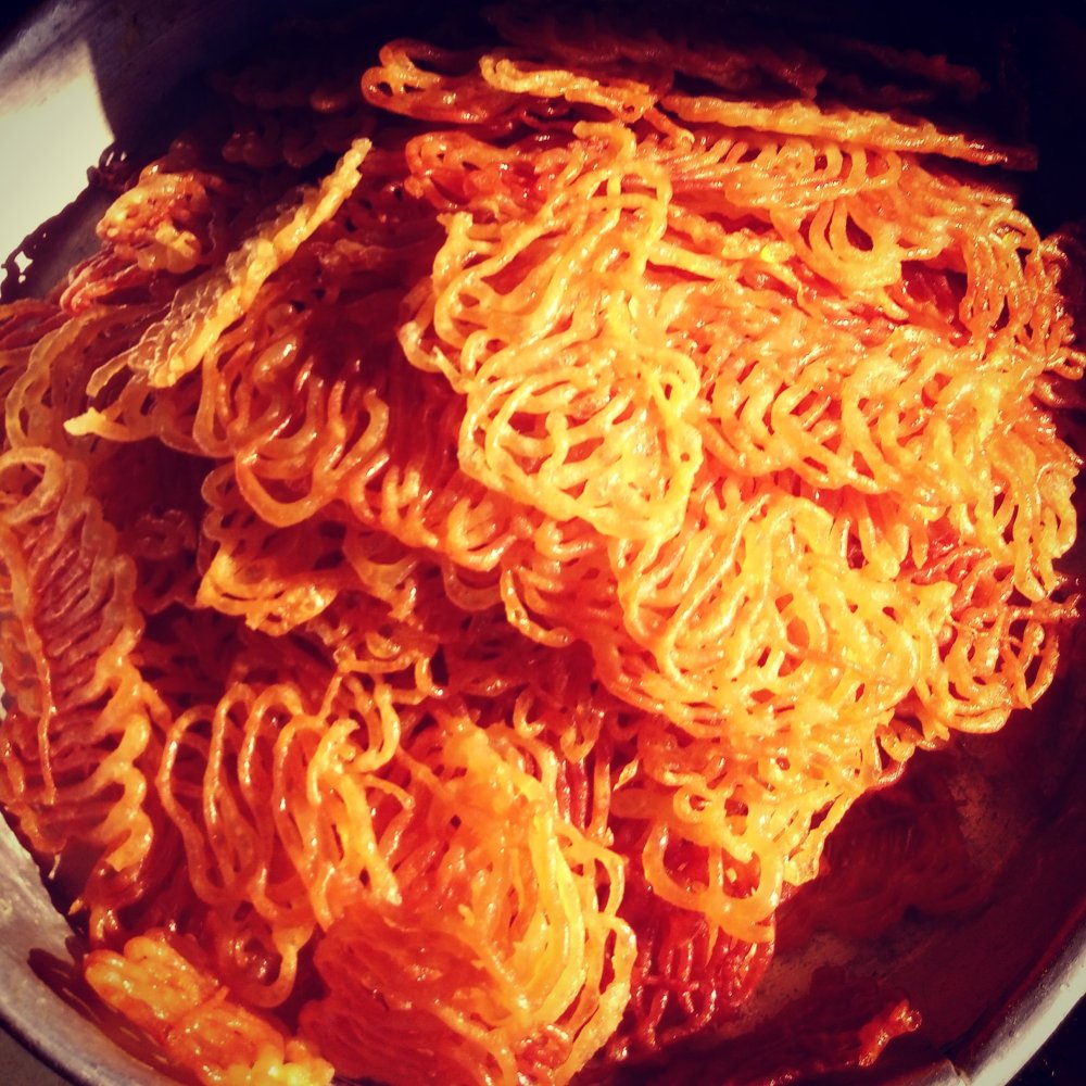 This is our perfect pick of a difficult food. Not because of the preparation time but more because of the perfection which one needs to achieve while frying the jalegi in the piping hot oil on flame. To get the perfect crispy jaleni the nozel needs to be calibrated to the minimum thickness and whats more is the design which you make is quite complicated. Then its important to fill the entire pan before you start turning them. And if you turn early the crispiness will not come and if you delay it will turn brown which is not a good taste. So balancing the timing of this fermented batter through the nozel is nothing less than wrestling in the heat.