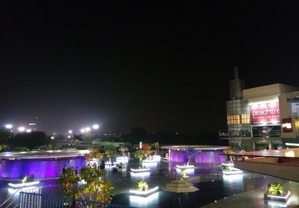 A very well designed open air sitting overlooking the Mall entry with a fountain right in front , have a look how it looks in the evening, colorful and calm with sound of water from the fountain in front.