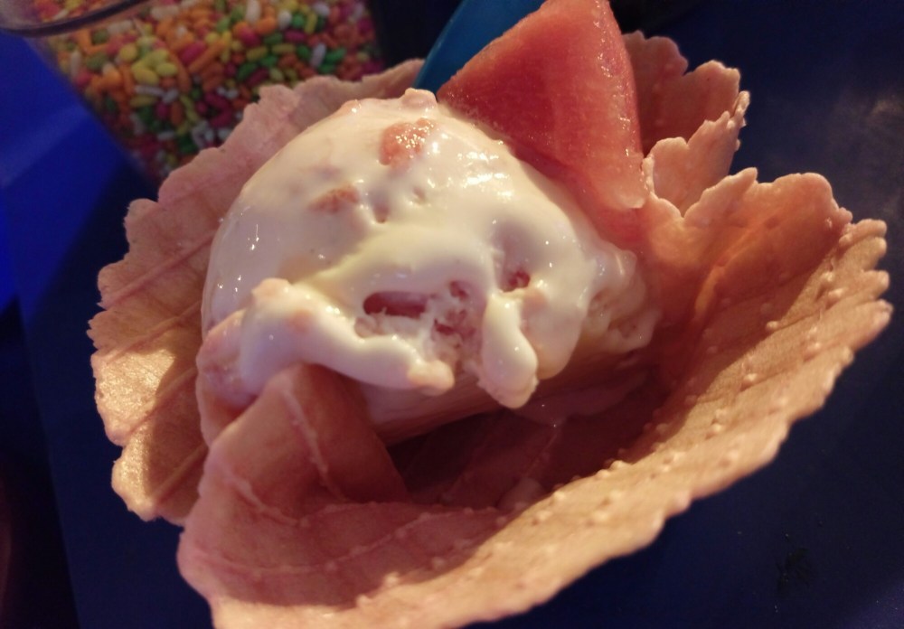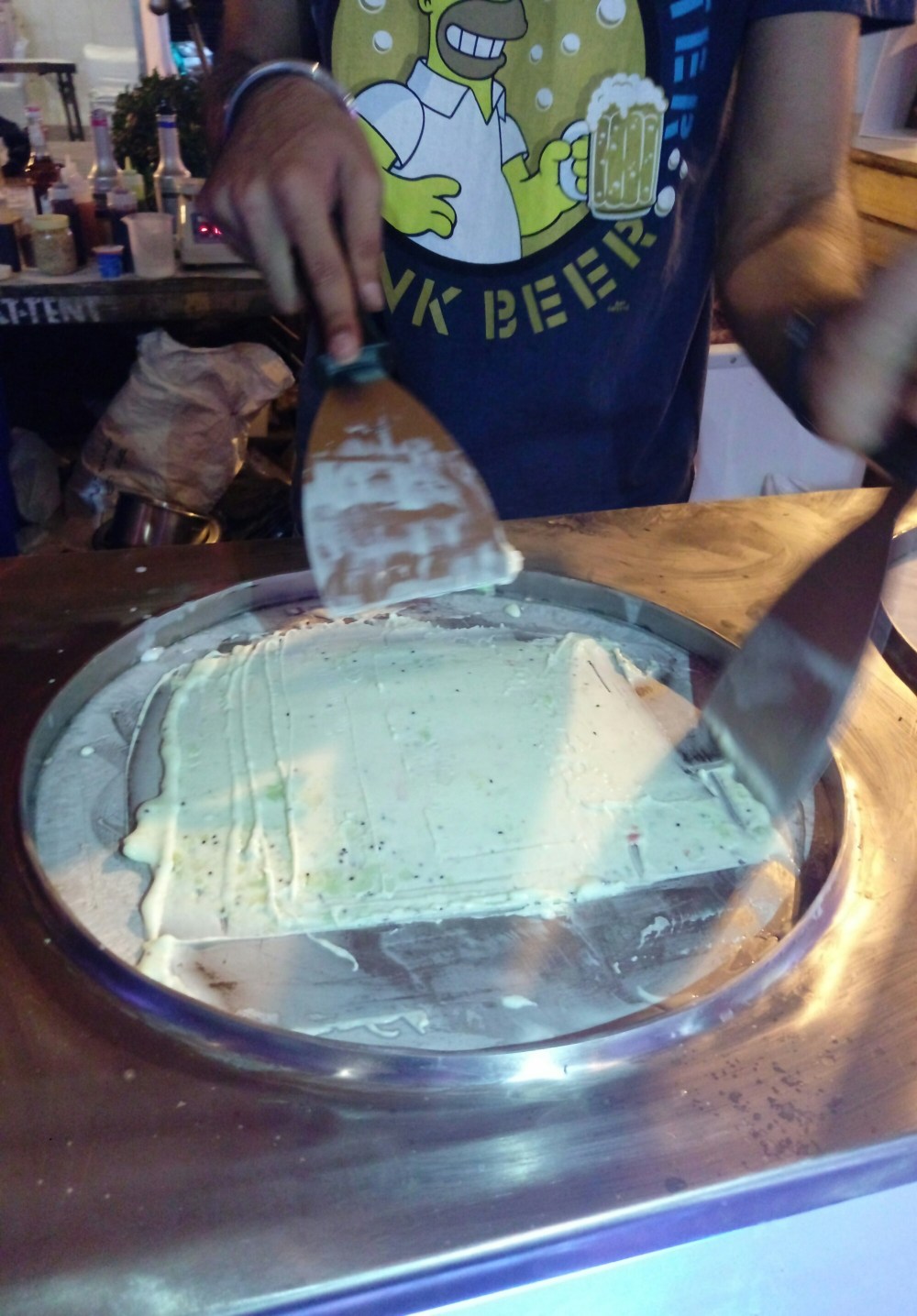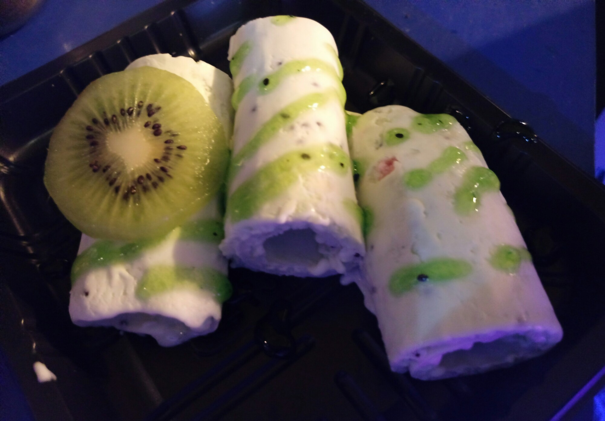 Kiwi ice cream roll from Let‘s Roll it’s a ice cream preparation on the plate with liquid nitrogen.