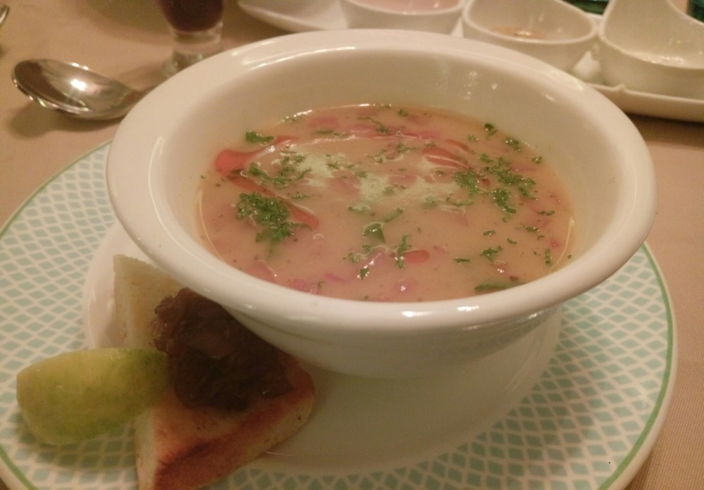 A Turkish version of soup , this is made of traditional red lentil ( masoor dal without chilka ) with glazed onion and croutons. Just to clarify croutons are sauteed rebaked bread served with soup and this one had some caramalised onion with a slice of lemon.