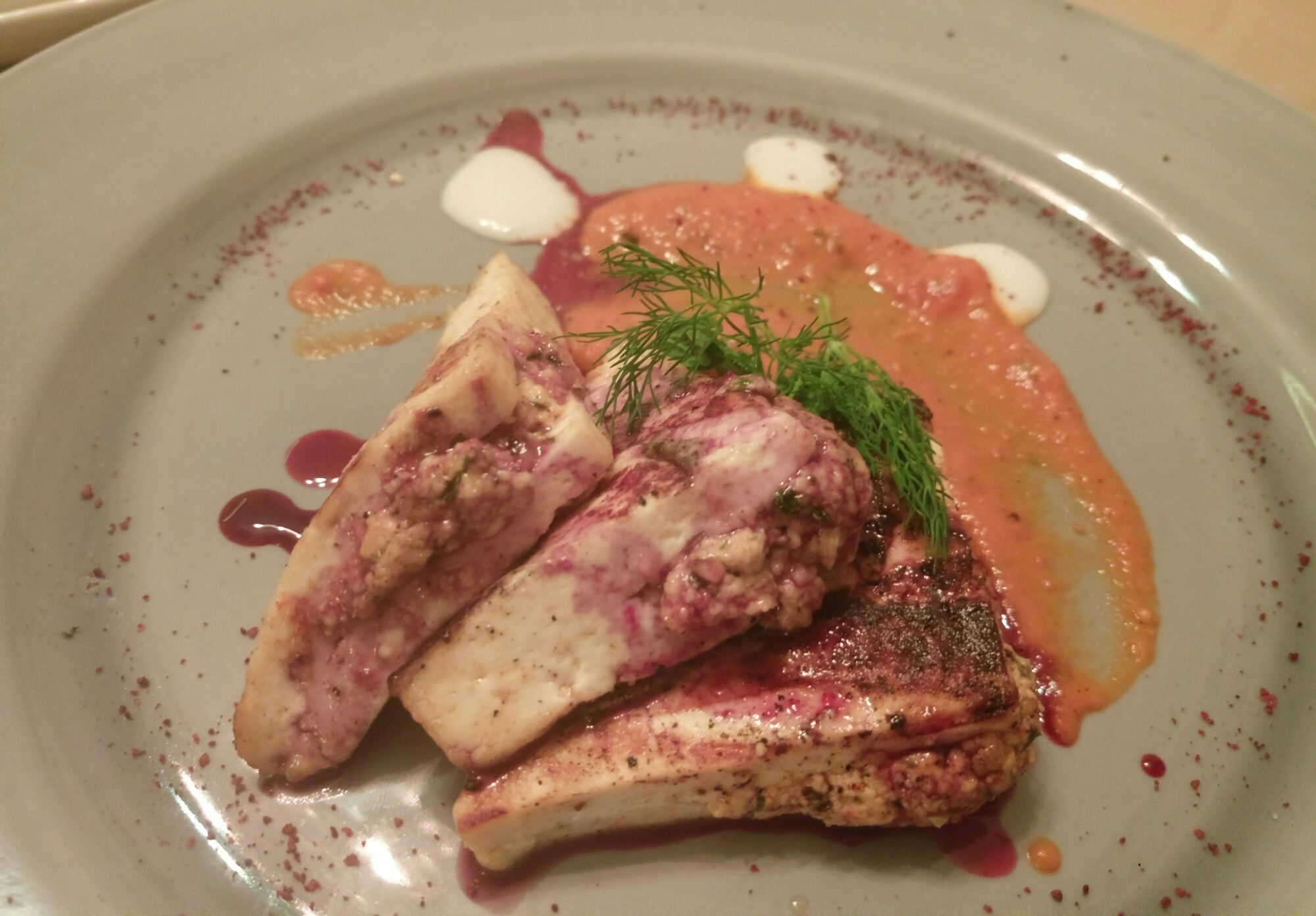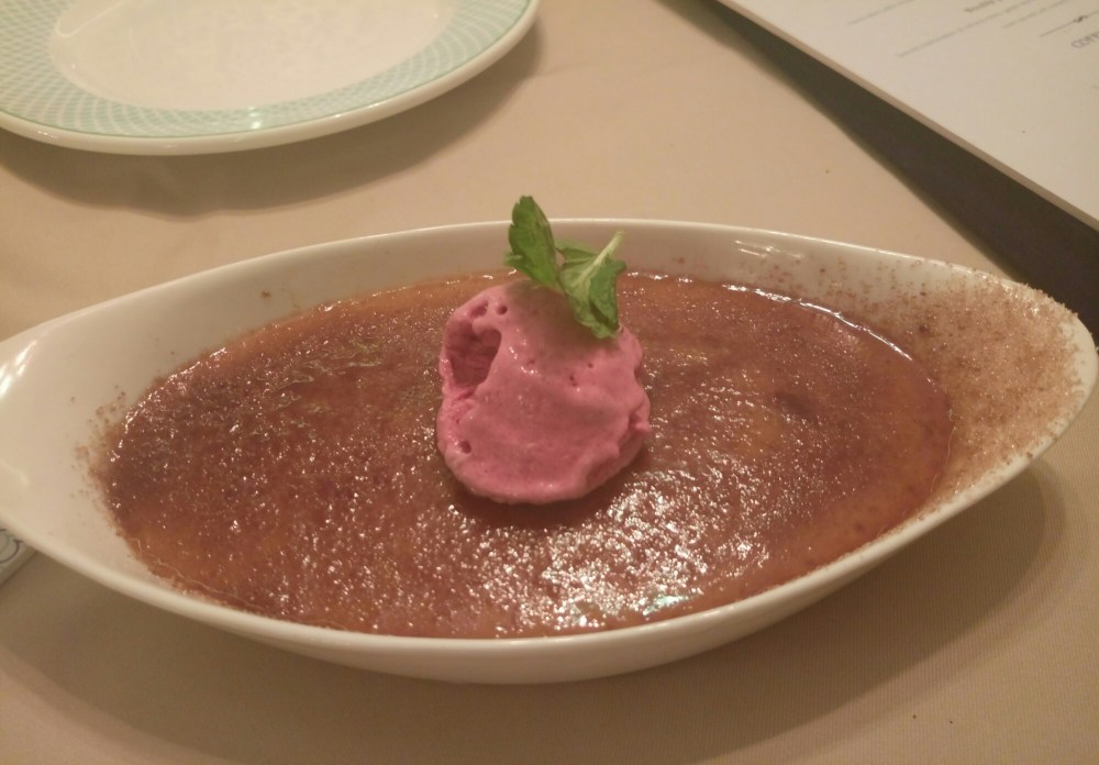 Caramel braised honey pumpkin infused vanilla citruses burned sugar crust and raspberry sorbet that’s what it derives its color from. While people liked it as it was served but for me it tasted better after the ice cream started melting.