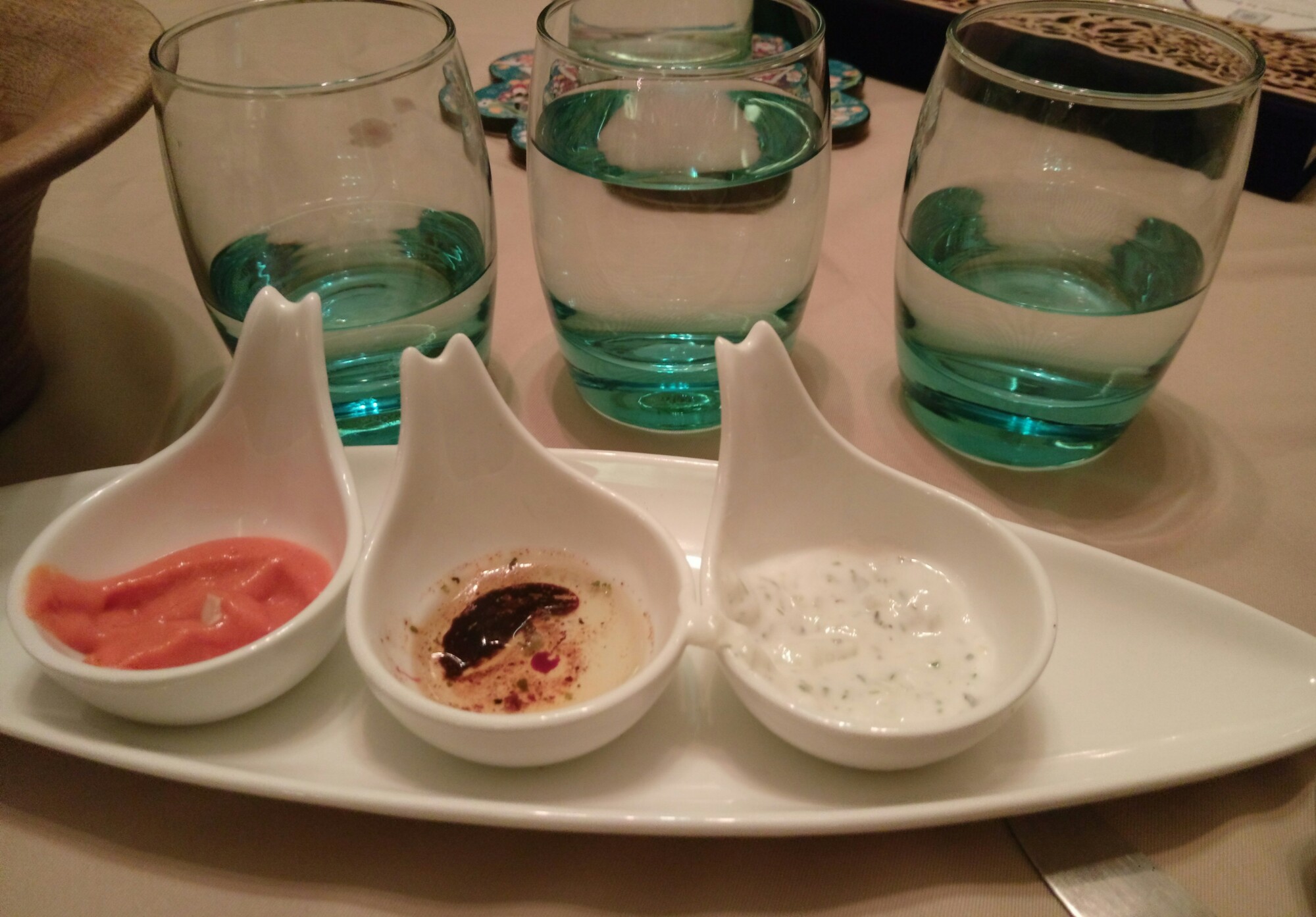 Serving starts with these dips – Almond taratora,Olive oil pomoglazed dressing, Dill (pulses) and cucumber dip along with a bread basket.