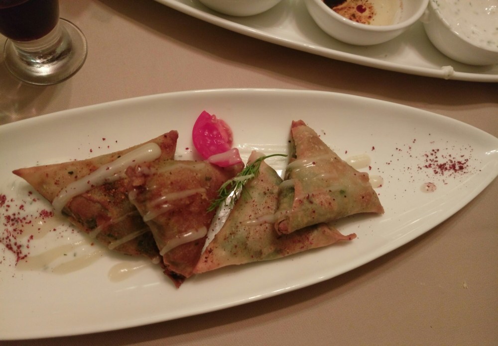 Spinach Fatayer: well while you look at this it might look like a member from the family of Indian samosa but Fatayer is actually a Middle East meat pie that can be alternatively stuffed with spinach. So vegetarian version was stuffed with spinach ( Sabanekh) and feta cheese (Jibnah). Fatayer is a part of Arabian cuisine and eaten in Iran,palestine, Jordan, Egypt, Syria and Lebanon. It may also be referred as Fitiir. This is also served with cacik sauce.