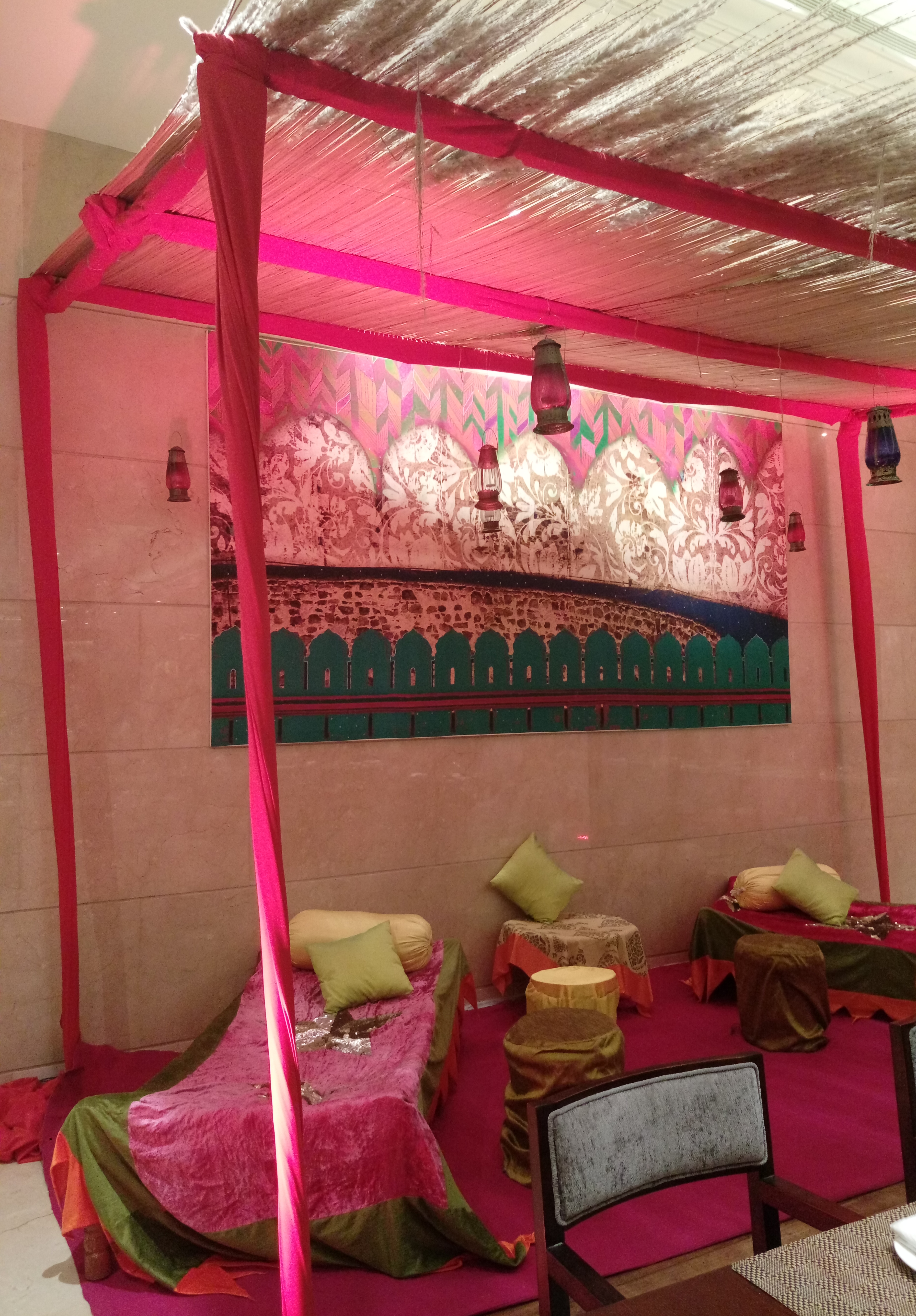 - Sitting corner created in multicolored drapes and the coats with beautifully done covers . And lanterns all around.