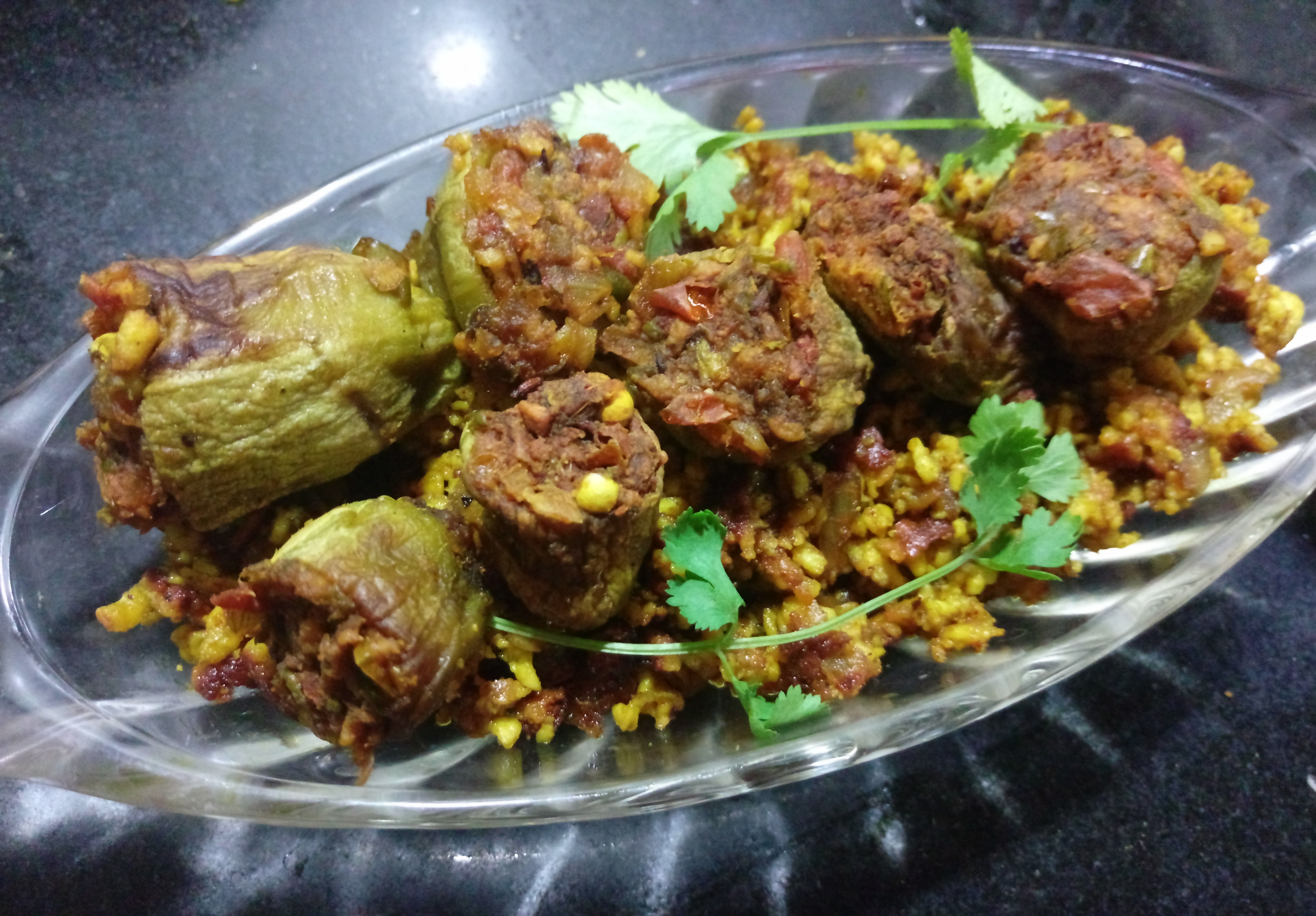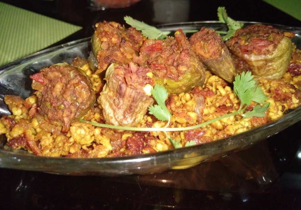 Cut the parwal into 2 halves and fill them with the stuffing. Put them in microwave and cook for 10 min and then lay them on the bed of Paneer.