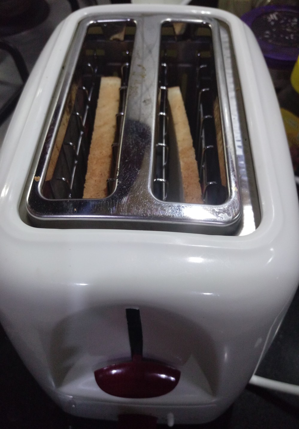 They are very careful while placing the breads. They placed the breads before they switched on the toaster.