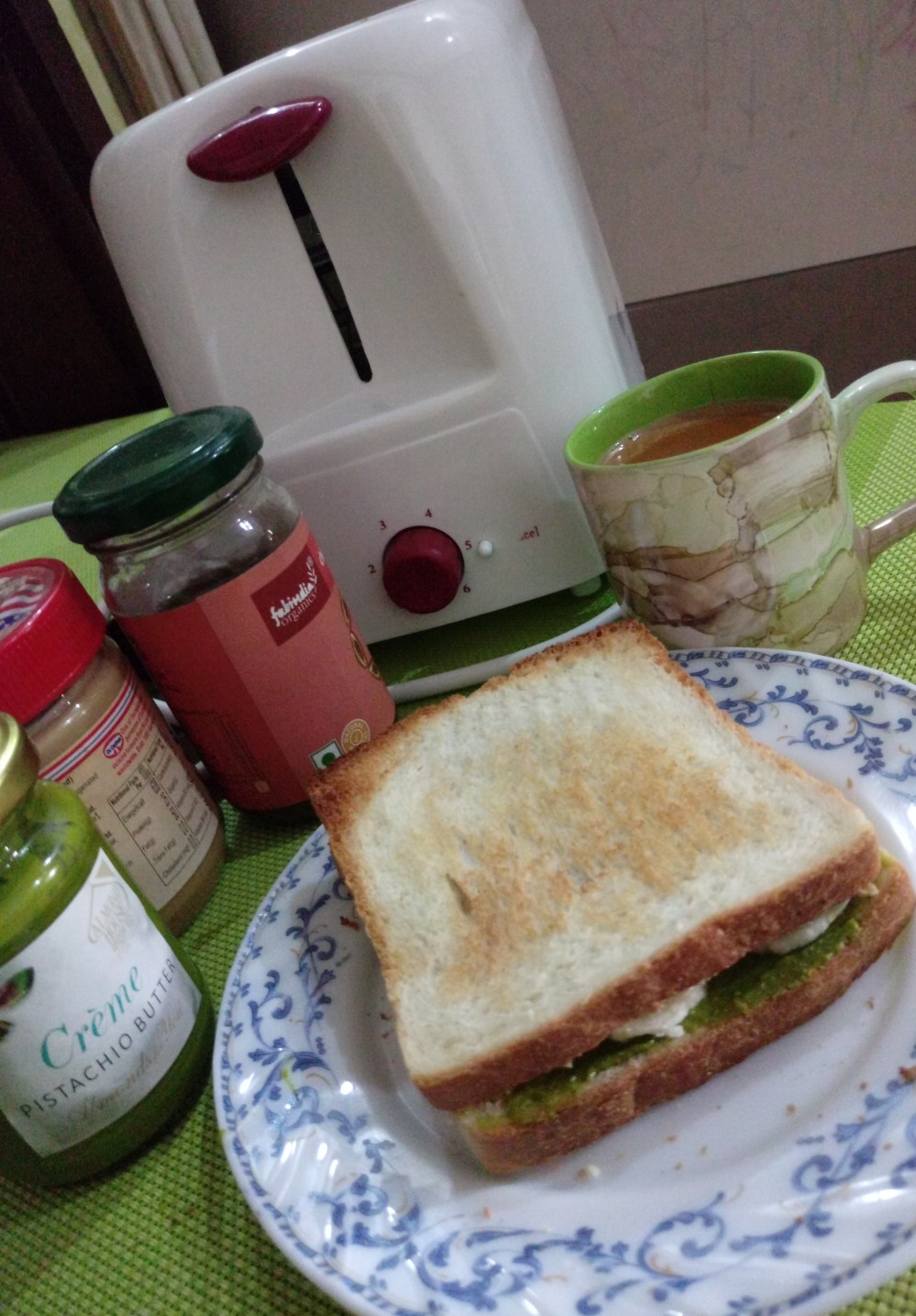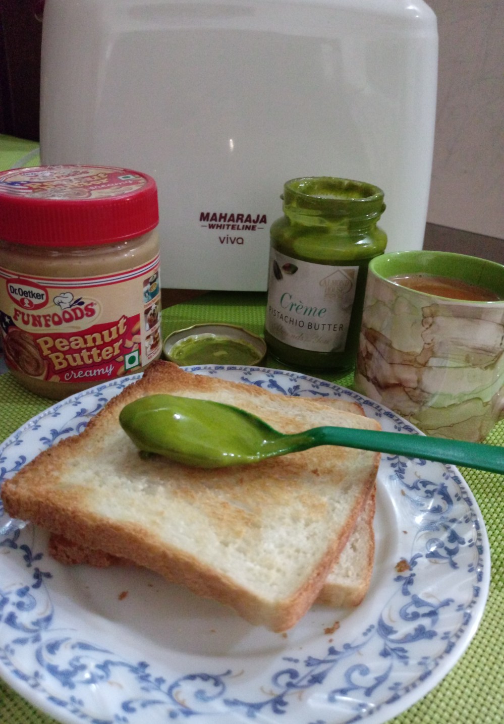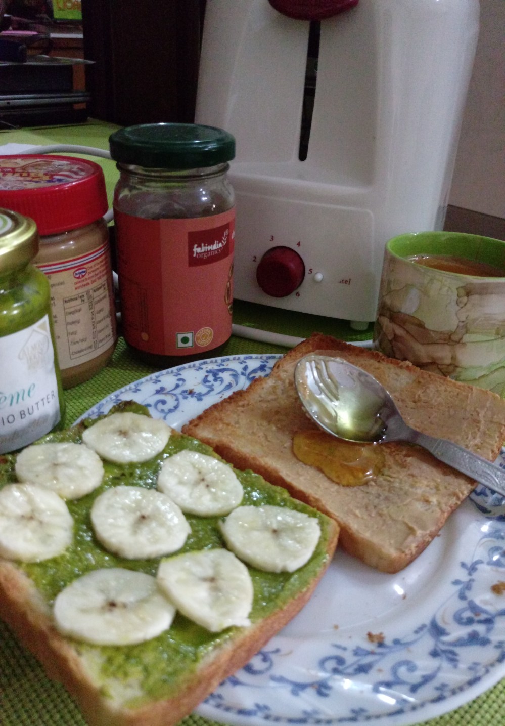 Butter Banana Toast: two perfectly crisp toast done in Maharaja Whiteline Viva Pop Up Toaster, layered with Pistachio butter on one toast, peanut butter on another toast, with a layer of honey and banana cut in circles.