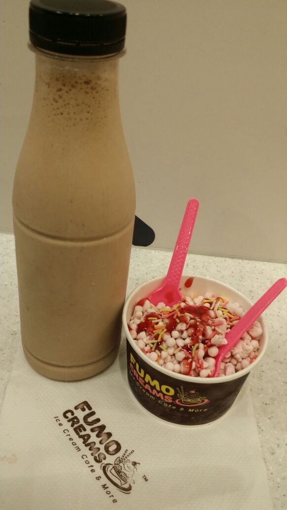 Have you ever felt like having chocolate chip for a dessert, if yes then Fumo makes it fun with flavors, I had this earlier at Niice ice cream and there they refer it as food of space which the astronauts eats, so ice pops are made by dropping the mixture in liquid nitrogen where it freezes to form small dots, the flavors are coffee craze, Topicandy , strawberry delight , blueberry Bliss, chocolate indulgence and Kesari Badam. Since we visited this place with kids so we ordered for strawberry Delight and these pink frozen dots were served with strawberry sauce.