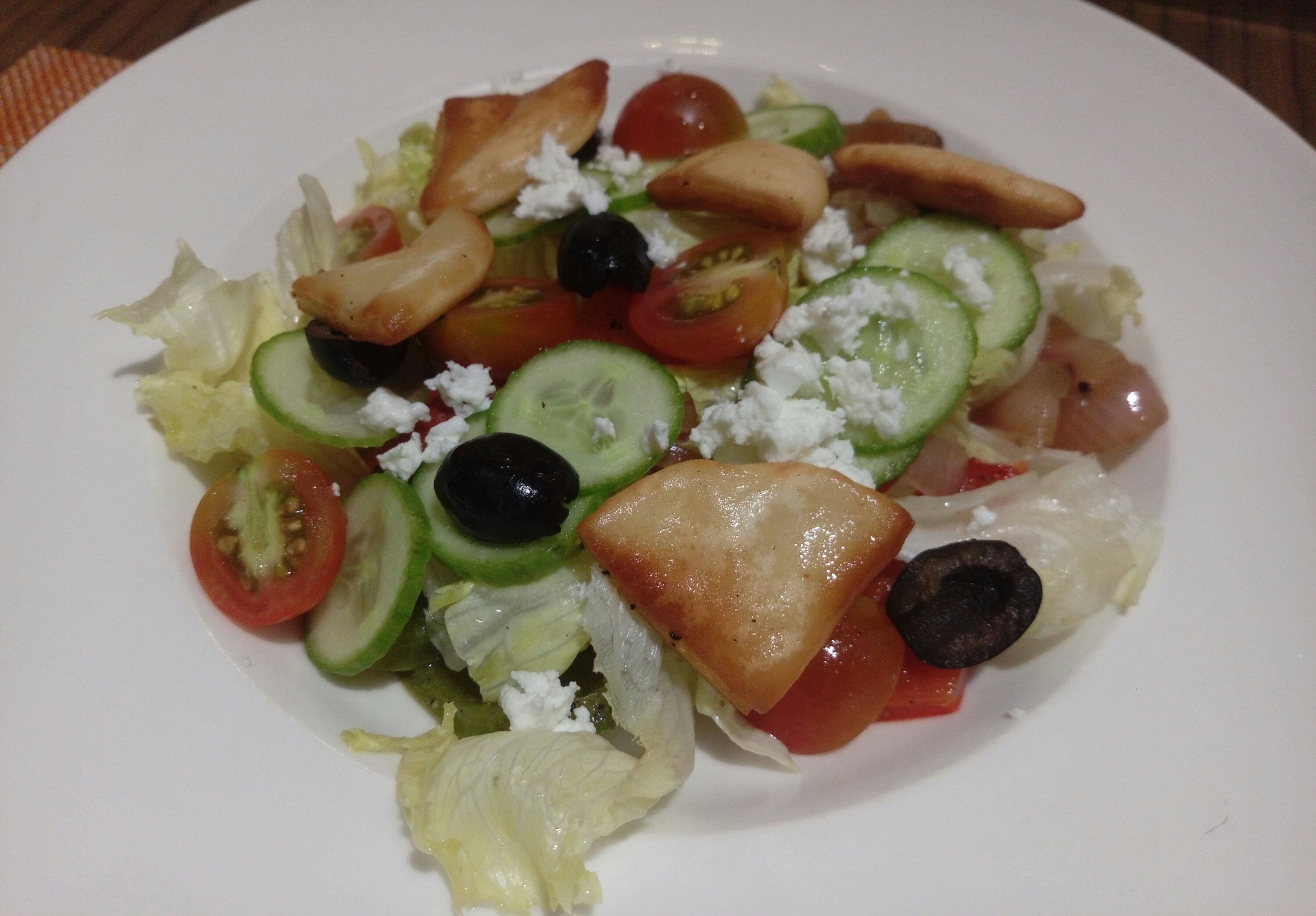 A combination of salad leaves in fried pita bread, cheese, cucumber and olives this was a great way to start my dinner. Completely refreshing dish.