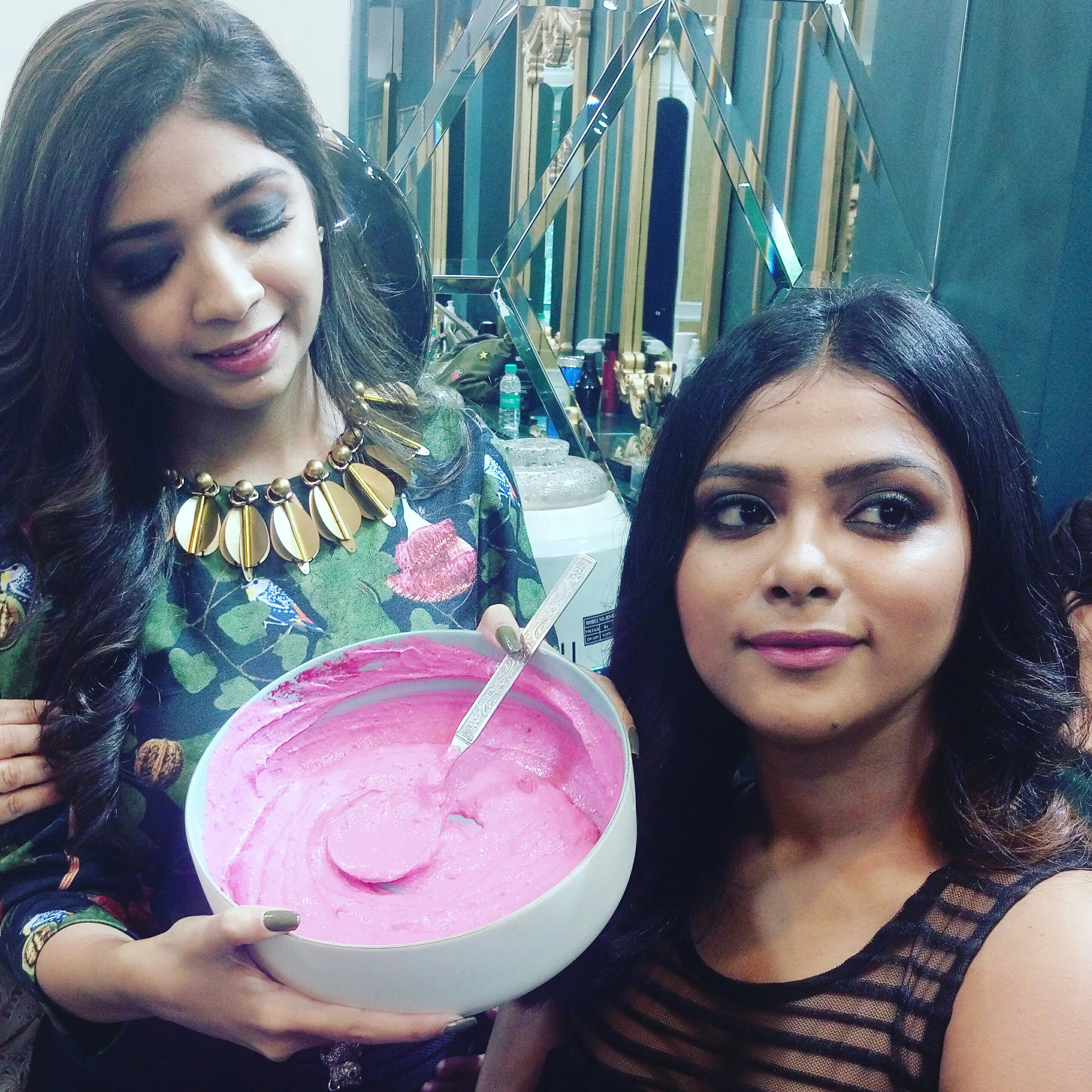 So we were in for a Pink dip dressing recipe and a Green smoothie recipe in food by Vandana while Shivani being a make up expert played on these colors with pink luscious lips and green smokey eyes which are in vogue these days.