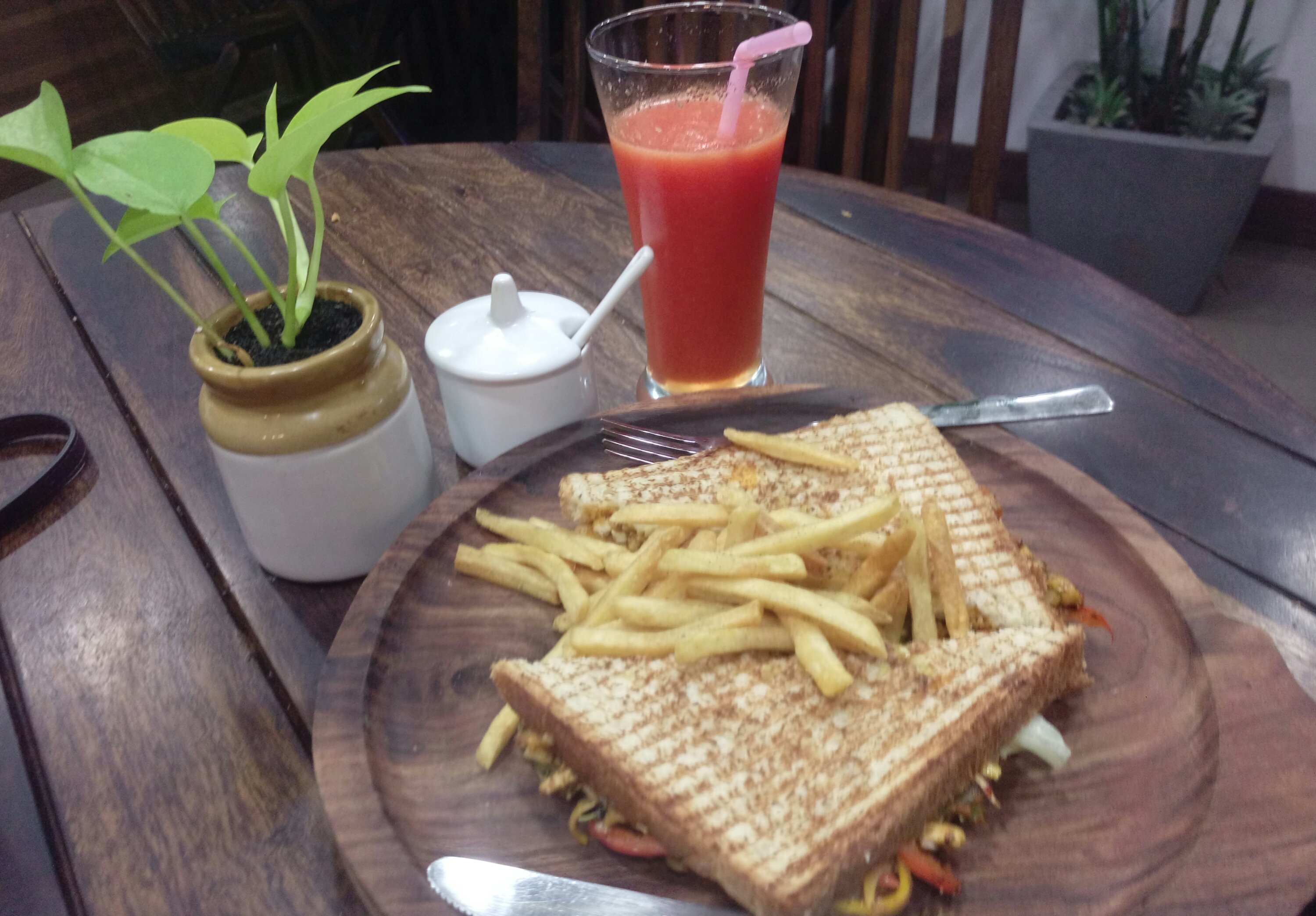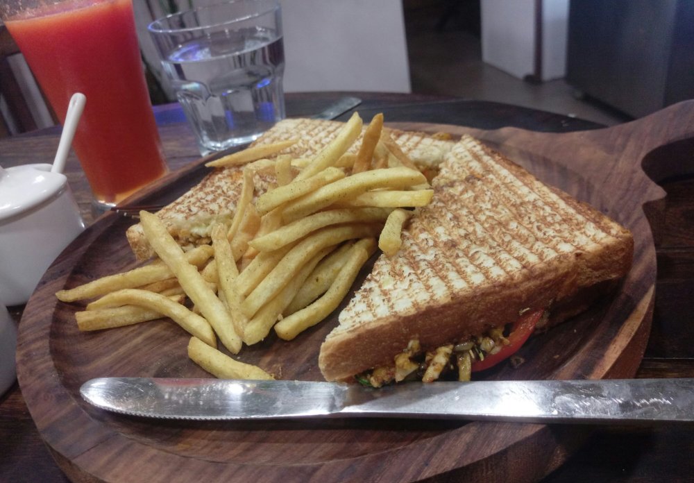 A sandwich was next on my list to eat, so ordered a Cottage cheese grilled sandwich. Served with super crispy French fries this was more than filling. But since I have already had the salad and the juice was also very thick and filling. You can see the chunks of Paneer literally coming out of the sandwiches. So could only have one piece and have to get the rest packed.