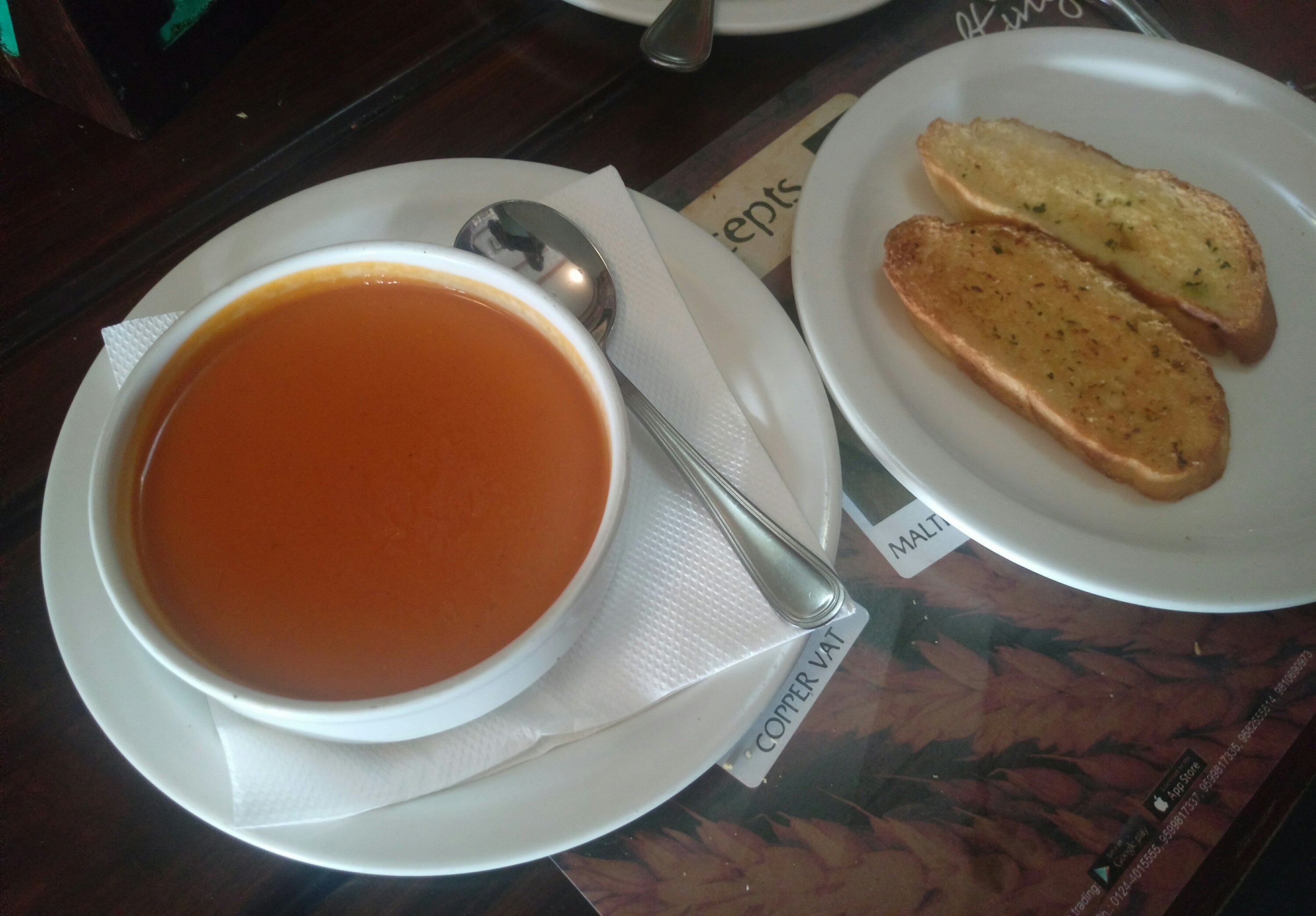 Roasted tomato orange bisque: A tomato soup is my all time favorite pick. this one was slightly sweet & citrousy conjured with a bold combination of roasted tomatoes and orange zest was served with garlic bread toast.