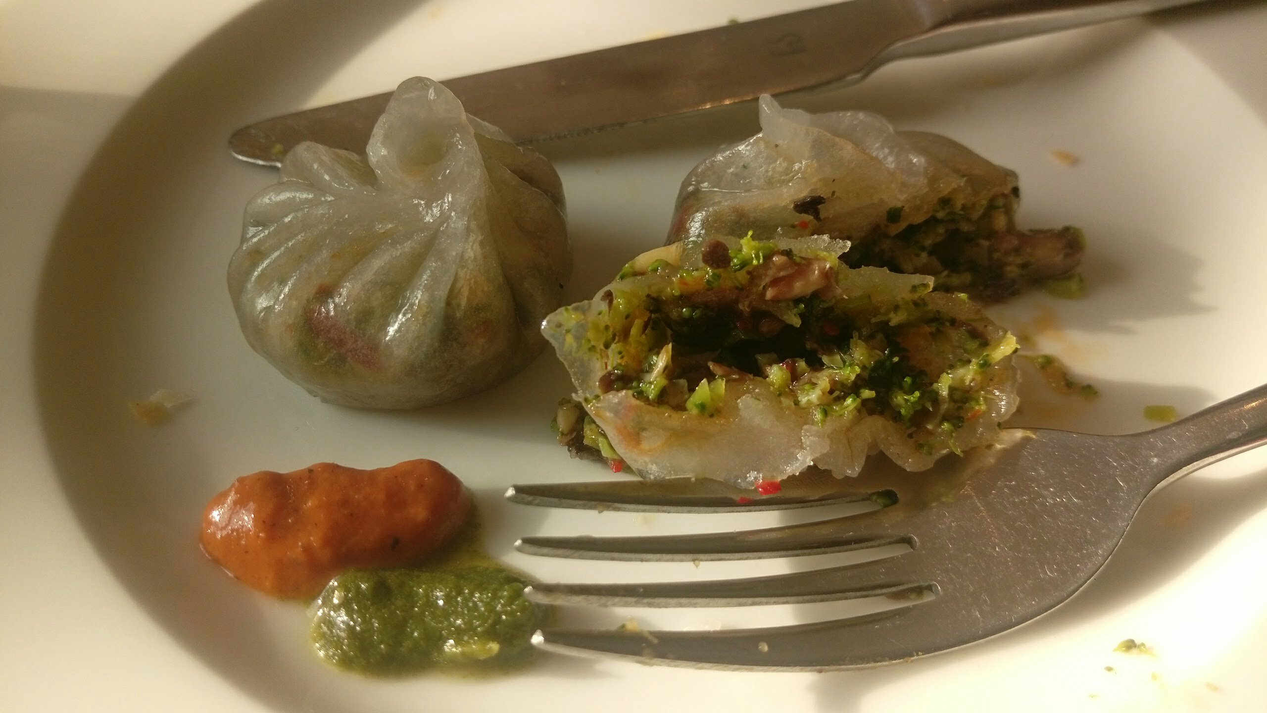 Steamed Crystals with Broccoli, Mushroom : I am not a dumplings persons normally but this combination appeared a rare one and with health on my mind I opted for it. Nicely grated mushroom and broccoli filling probably comes from a moms kitchen where she is determined to make the kid eat the greens. Jokes apart but this was one of the most palatable Brocolli I had in a filling that was all good to the core and healthy was a bonus to it. Served with 2 different chutneys but trust me these crystals were great on taste that I skipped the chutney on my plate.