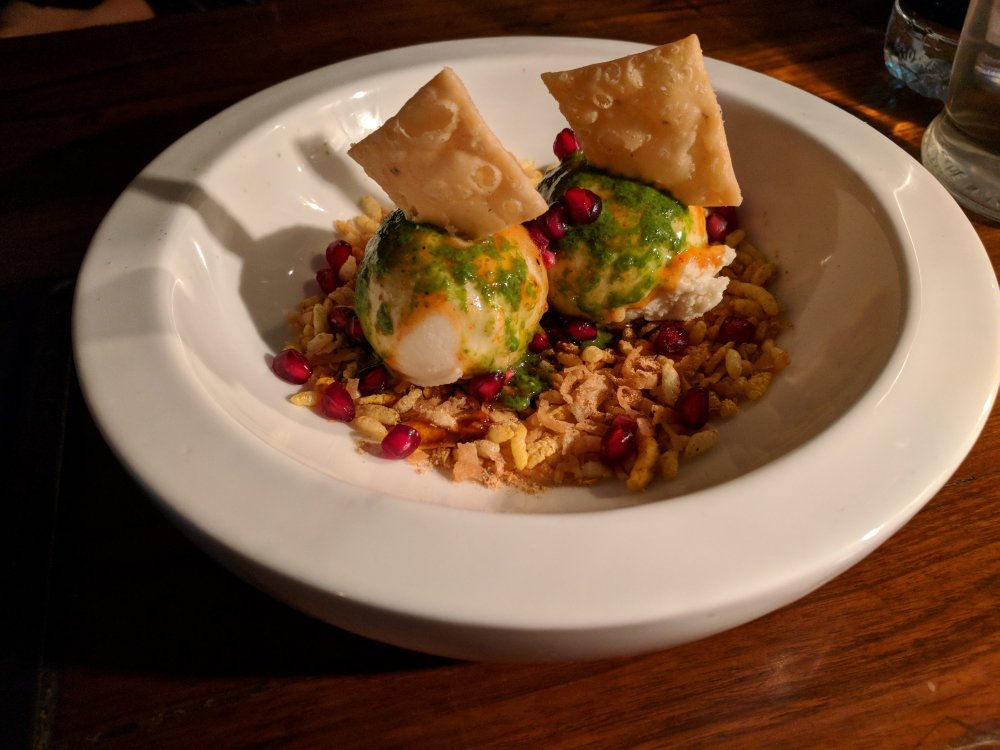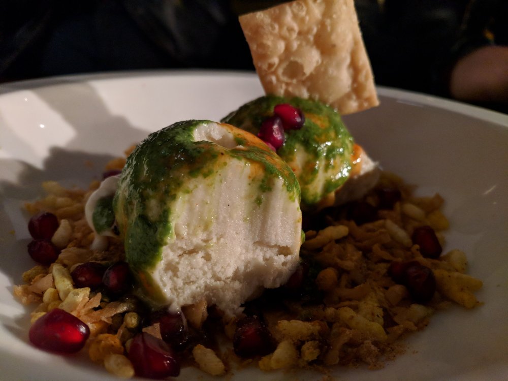 Yes you look at the dish and can easily get pranked for it to be an ice cream. As it’s closer to a ice cream that tastes like a Dahi Bhalla. Well garnished with the bhel and chutneys, is truly a delight to taste buds and eyes.