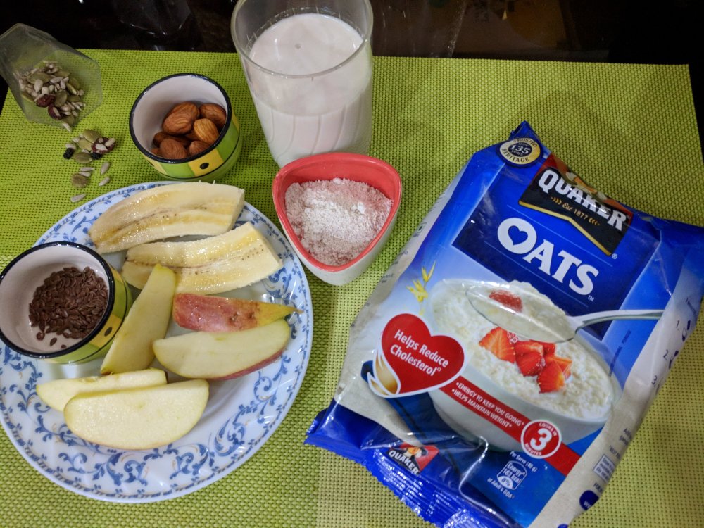 But as she briefed me on starting the day with this smoothie I was super happy. Not that I love diet food but more because one of the ingredients in the Healthy smoothie that she suggested had Oats and I had this oats Packet which I got in the health hamper early this month was lying unused as I don’t like plain oats. So here you go with my #GetRealFit challenge Breakfast routine.