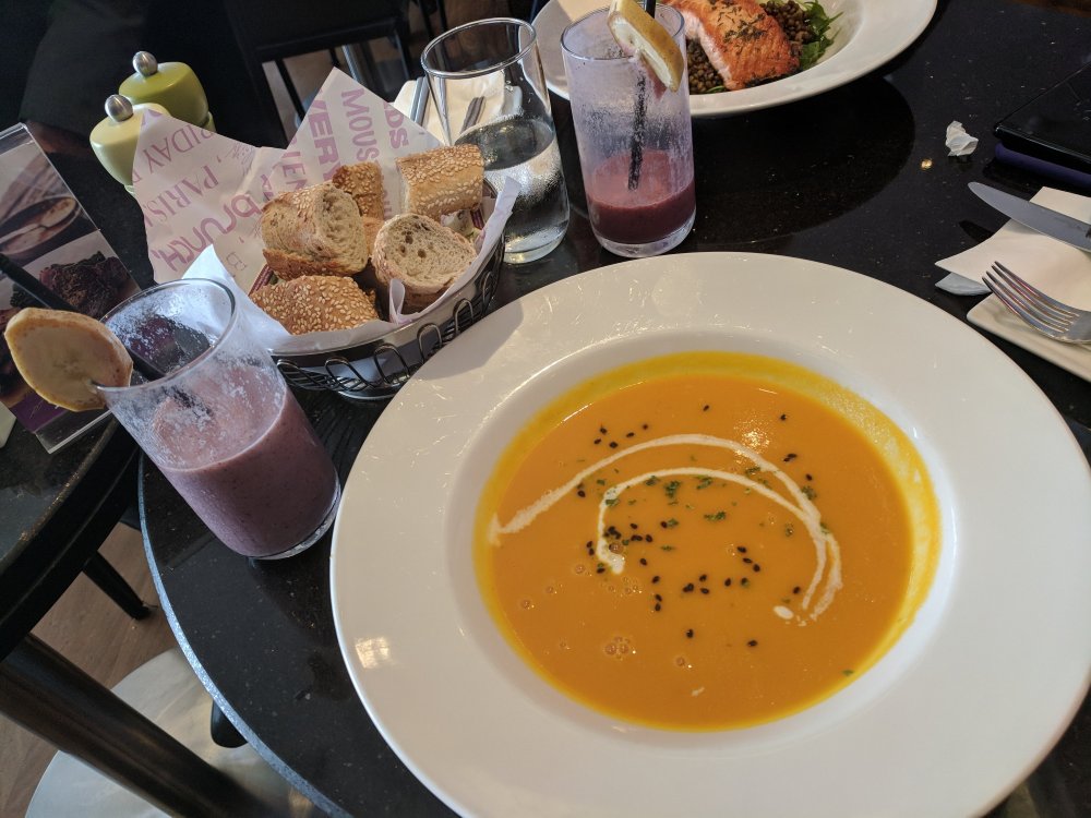 Soup – Carrot and Coconut soup : Well coconut is one of my favorite ingredients but had in soup for the first time. Now let me tell you the French name of this Soup “Potage De Carrotes, A La Noix De Coco ” ,it was quite filling and had this beautiful yellow color due to turmeric and the black Seasme seeds added to the look with coconut milk as garnishing.