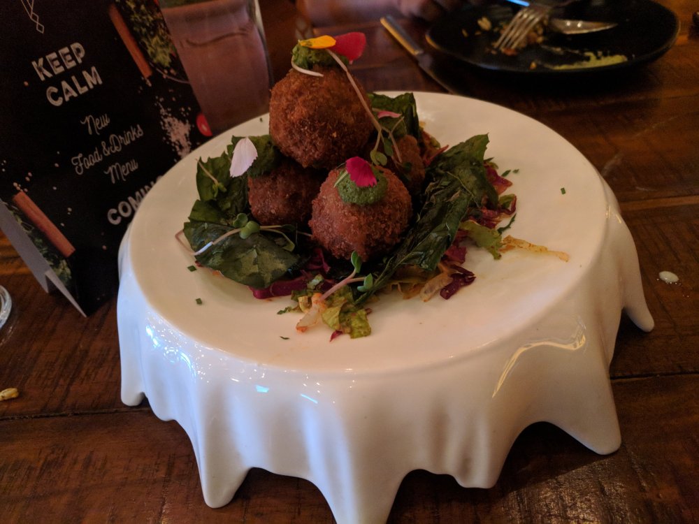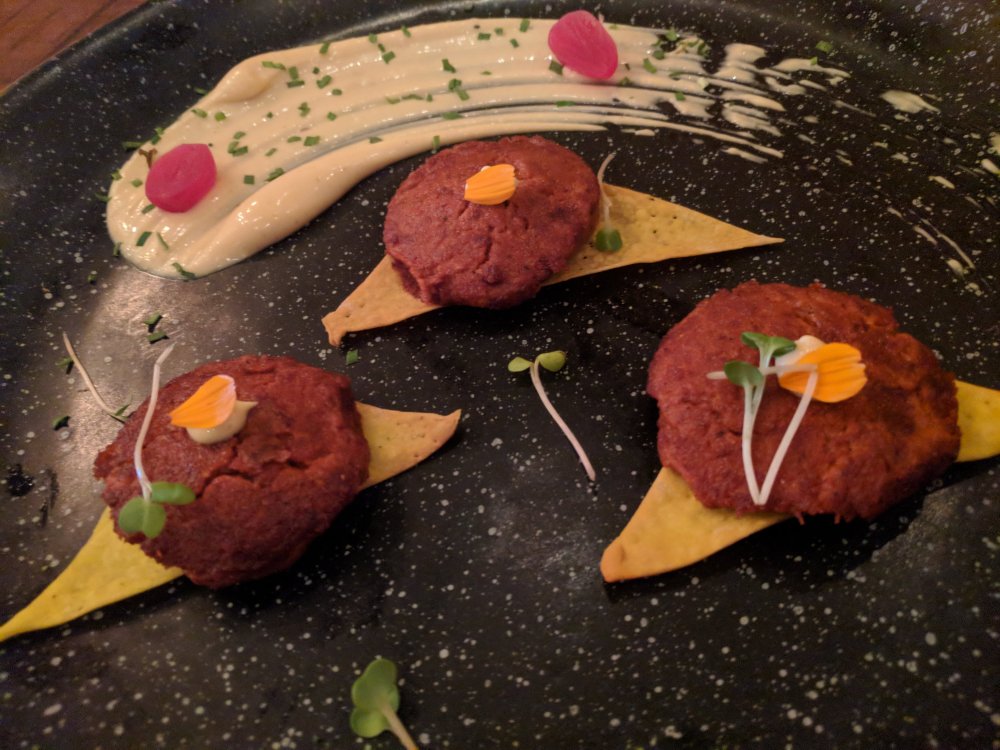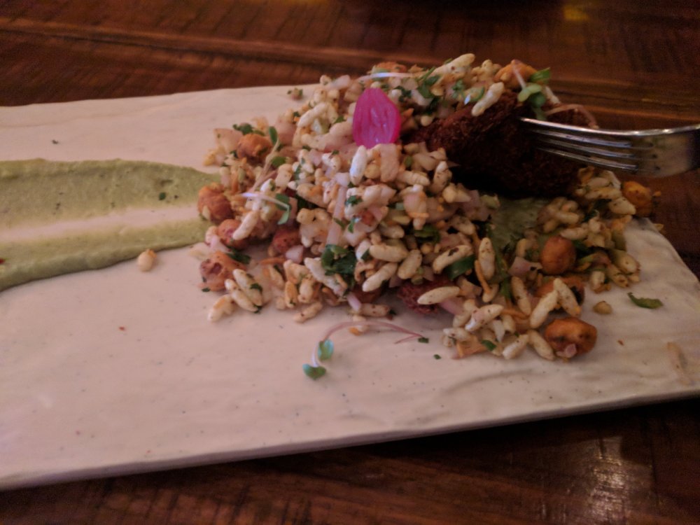 Crispy Beetroot Coriander hummus Avocado Jhalmuri : As something from East but with a twist. Probably one of the best thing to have with drinks, that’s light , spicy crispy, crunchy and off course very very tasty. The beetroot is made into a pakoda that’s very very crispy. And the Jhalmuri style bhel stands out definitely.
