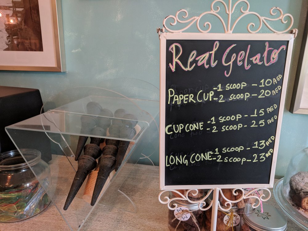 Paper cup was priced at 10 AED per scoop and Cup cone was for 15AED per scoop while the long cone was for 13AED .