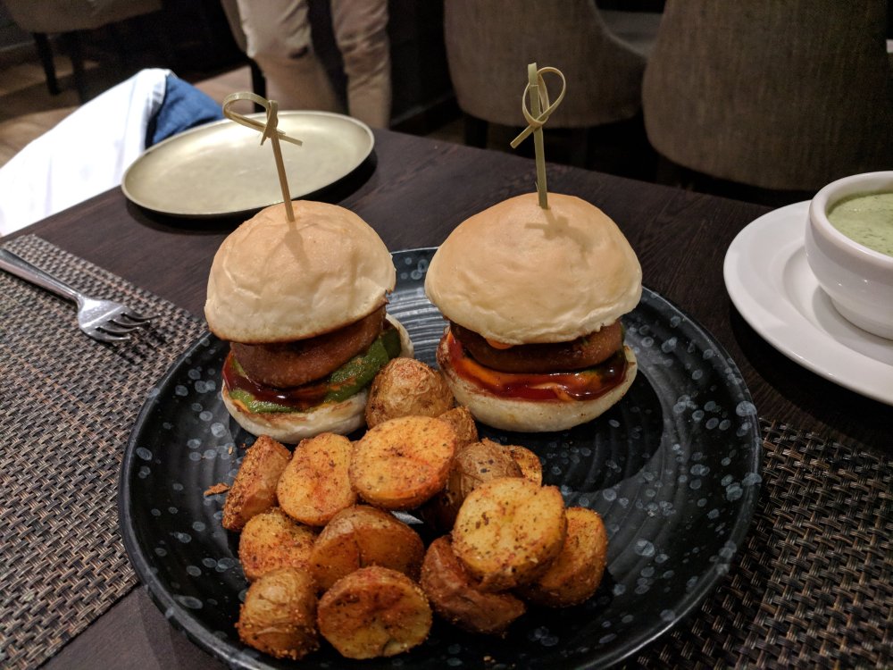 # Bun Chori : priced at Rs. 255/-, this is a burger with kachori as the Tikki in it and it is super tasty combination. Served with fried baby potatoes and mint chutney it’s a good pick
