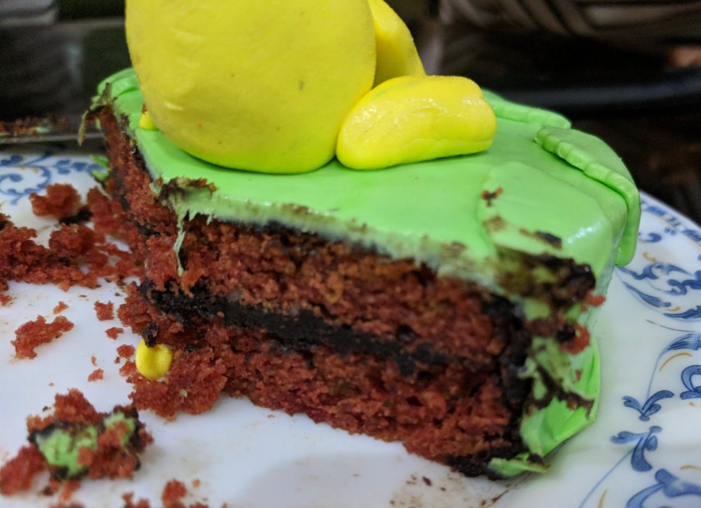 But since it was just six of us and I didn’t wanted to waste the cake so when I requested for half a Kg they agreed but said the entire design will be compromised but I said doesn’t matter I want a green cake and here was the half kg version of the cake. Looked cute and fitted so well in a quarter plate just the way I wanted it to be for the dinner table.