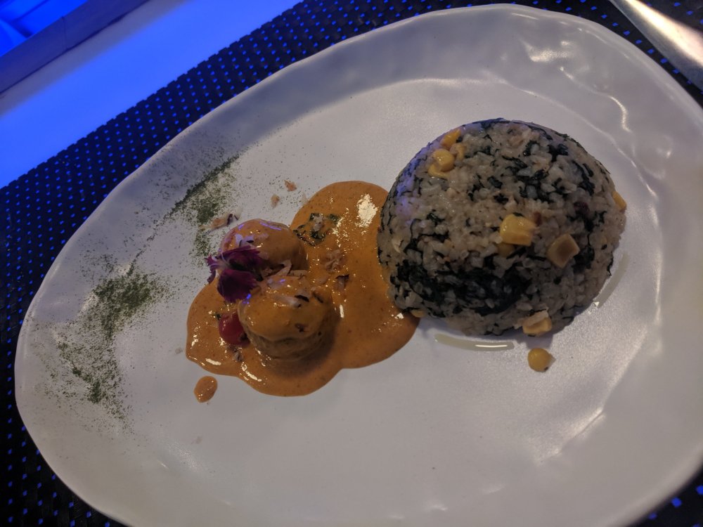 House made Banana bonda with Spinach Rice : Sometimes you look at the food and you feel like having it, this was the main course and had the Banana bonda in the Thai Curry served with spinach rice and corns and the aroma of this dish was in the air while it was served and perfect flavors .