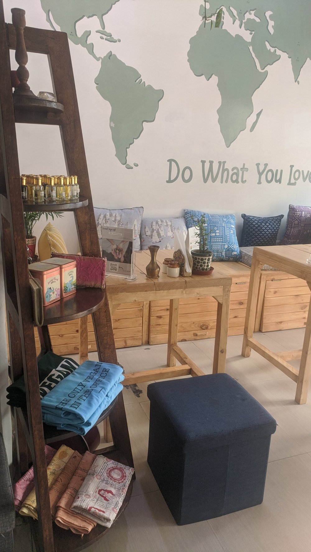 Let me take you on a quick virtual tour of the inside of the cafe across two floors. The ground floor is the entry and with amazing sitting space along with a retail corner/ stand that offers clothes , scents , cloth bags etc. Comfortable cushions and seats with both couch and high chair options