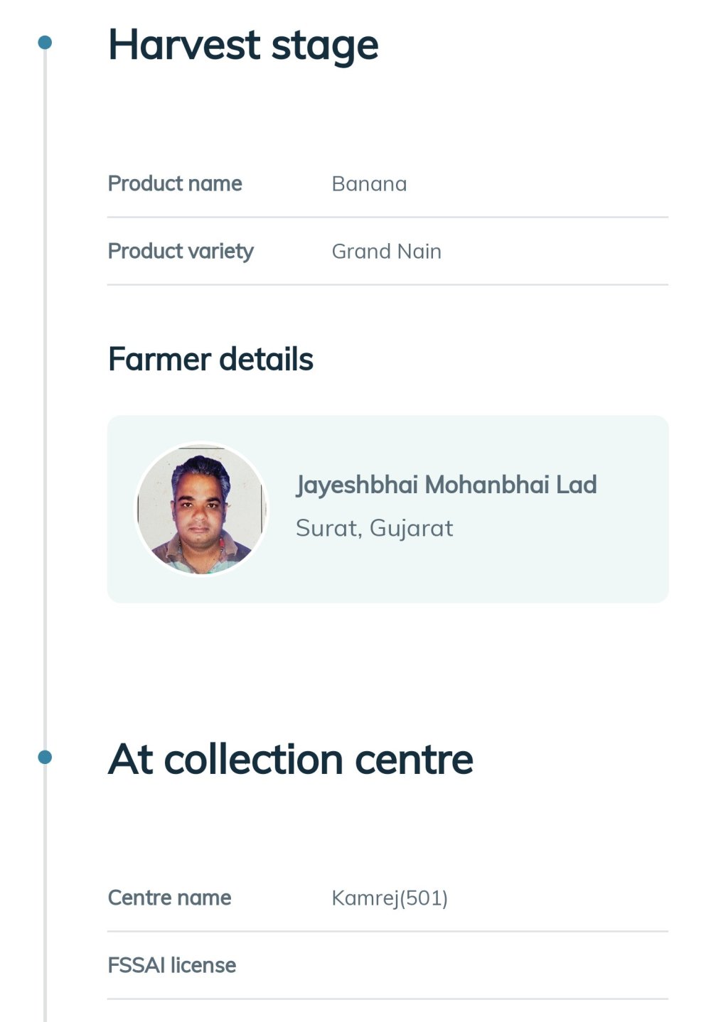 And the information included the harvest stage of banana , variety, the farmers detail, the collection centre, location of the collection centre with the Google map, goodness features of the banana in processing it with the name and licence number of the cold storage these bananas were stored along with the details about the supplier with the complete social media links. Isn’t it overwhelming.